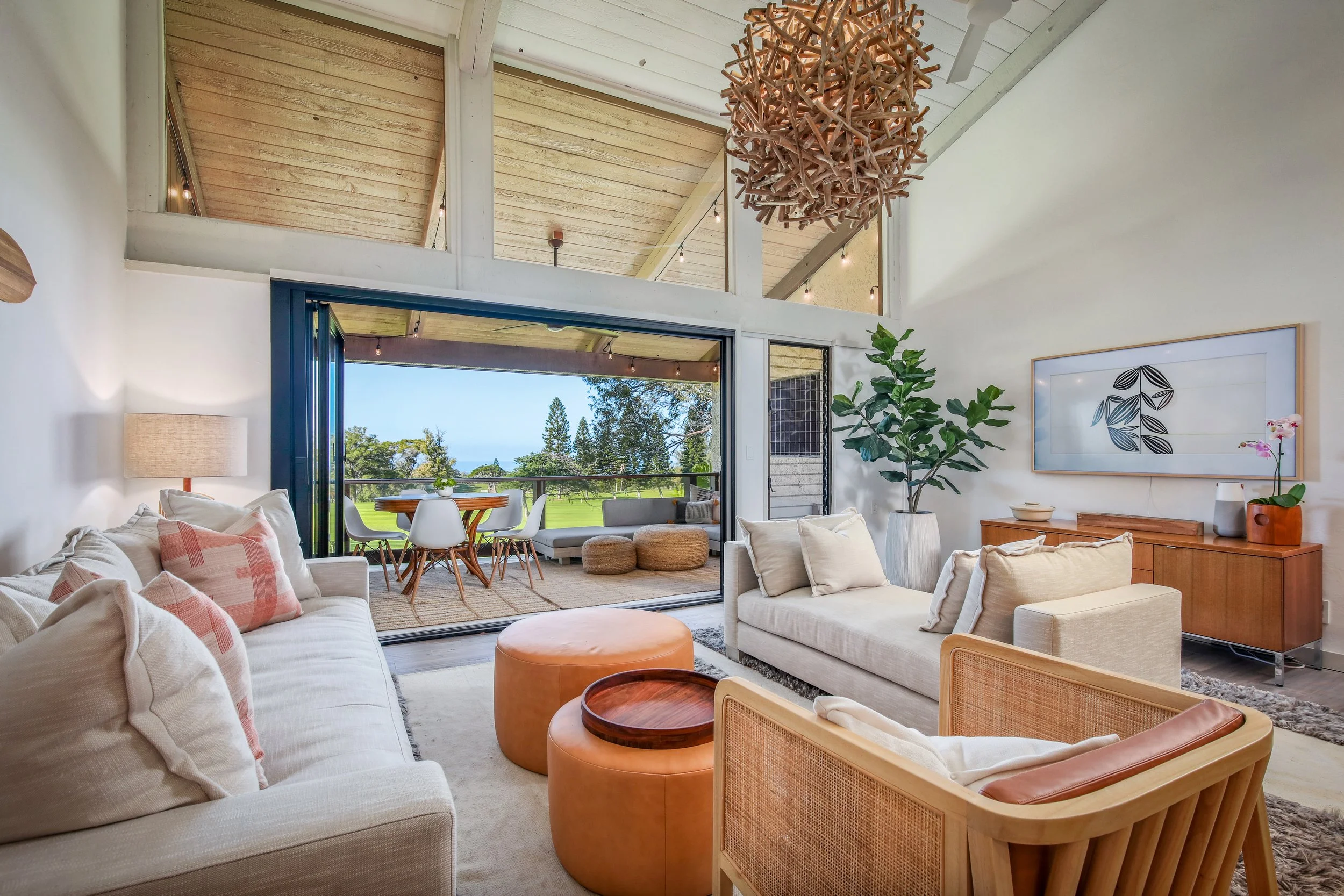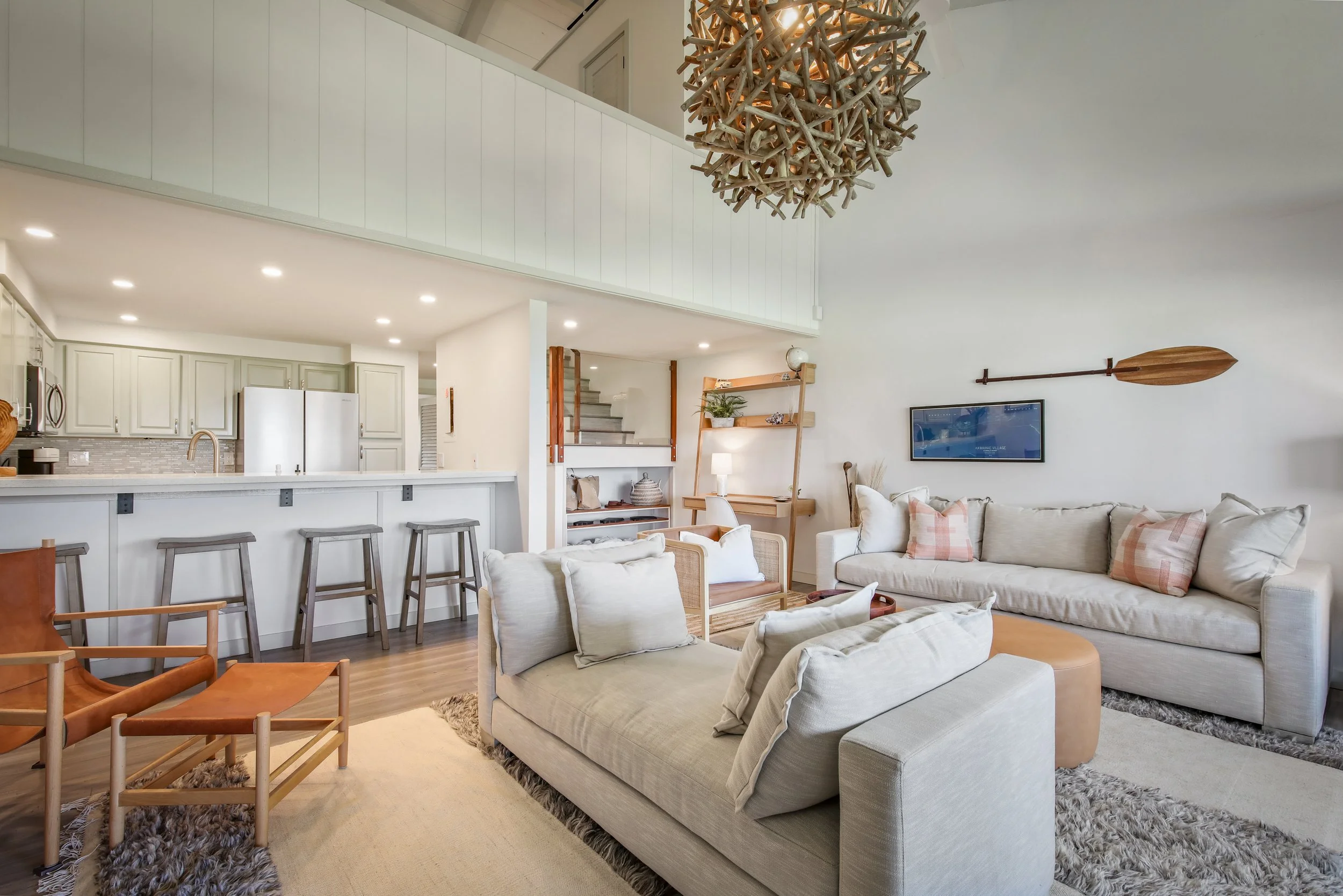 70’s designed condo loft turned our mid century juices flowing! When we found a few choice mid century pieces, we let this Big Island retreat pull from those color and materials. The result is a neutral color palette that allows the outside beauty and view to shine.